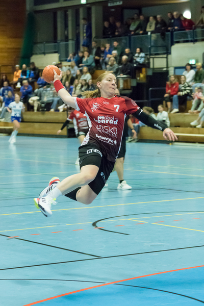 Bereits zum Start der Partie in den ersten Minuten wurde klar, dass die Abwehrreihen den gegnerischen Angreifern das Leben schwer machen würden. Zwar konnte der SCV durch Tore von Carla Pfetsch, Alicia Staigmüller und Leonie Schiller zum 3:1 vorlegen, aber da waren schon sechs Spielminuten absolviert. Auffällig war schon zu diesem Zeitpunkt, dass alle Treffer von den Außenpositionen erzielt wurden. Danach leisteten sich die Vöhringer Frauen einige Ballverluste sowie technische Fehler und bekamen mit dem 5:7 Zwischenstand nach 13 Spielminuten dafür die Quittung. Doch insbesondere die Vöhringer Abwehr steigerte sich von Minute zu Minute und Torfrau Nadja Max war wieder ein bärenstarker Rückhalt; sie machte viele Torchancen der Gegnerinnen zunichte. Alicia Staigmüller (3x), Carla Pfetsch und Lilli Hieber mit einem blitzsauberen Tempogegenstoß sorgten für den 8:8-Ausgleich. Eine 4:0-Serie des SCV – alle Treffer erzielte die an diesem Tag in Topform aufspielende Theresia Miller – sorgte für ausgezeichnete Stimmung bei den wieder lautstark und zahlreich vertretenen Vöhringer Fans. Einen verwandelten Vöhringer Siebenmeter konterte die SG Lauterstein/Treffelhausen/Böhmenkirch mit dem 13:10 direkt vor der Pausensirene. Die Halbzeitführung hatten sich die SCV-Mädels insbesondere mit der Defensivleistung verdient; in 17 Spielminuten vor dem Seitenwechsel ließ man gerade mal drei Gegentore zu.