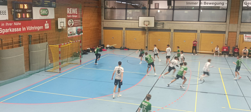 Zu Spielbeginn fehlte die geistige Frische und so war man in der Abwehr oft einen Schritt zu spät und im Angriff leistete man sich einige leichte Ballverluste gegen eine sehr früh angreifende Waltenhofener Mannschaft. So stand es nach 10 Minuten 5 : 5 Unentschieden, was aus SCV-Sicht vor allem unserem Torwart Lenny zu verdanken war. Jedem Vöhringer war bewusst, dass eine Steigerung nötig ist, um dieses Spiel zu gewinnen. Und die jungen SCV-ler zeigten nun welches Talent in ihnen steckt, bissig in der Abwehr und mit dem schon gewohnten Tempohandball erspielte man sich bis 30 Sekunden vor dem Halbzeitpfiff eine 23 : 12 Führung. Durch 2 leichtsinnige Fehler konnte der TV Waltenhofen noch auf 23 : 14 zur Halbzeit verkürzen. Zu diesem Zeitpunkt war das Spiel äußerst fair, je eine Zeitstrafe pro Mannschaft und auch keinerlei Unterbrechungen wegen Verletzungen.