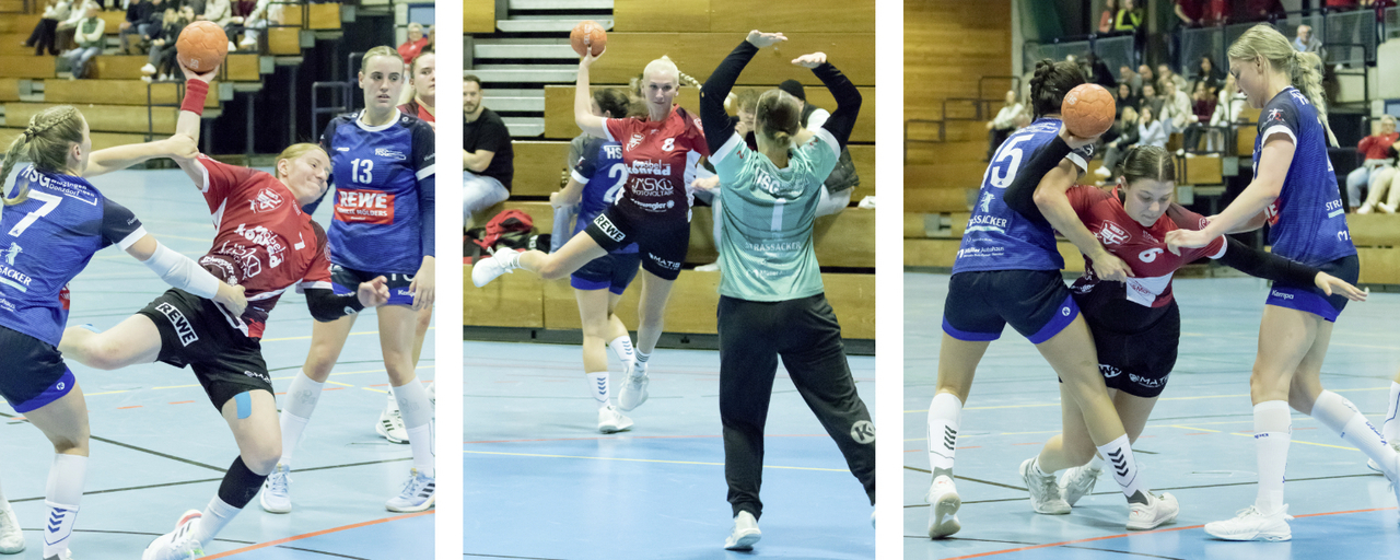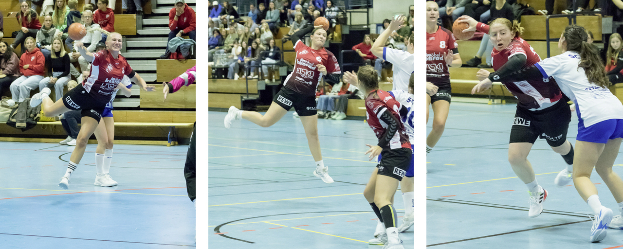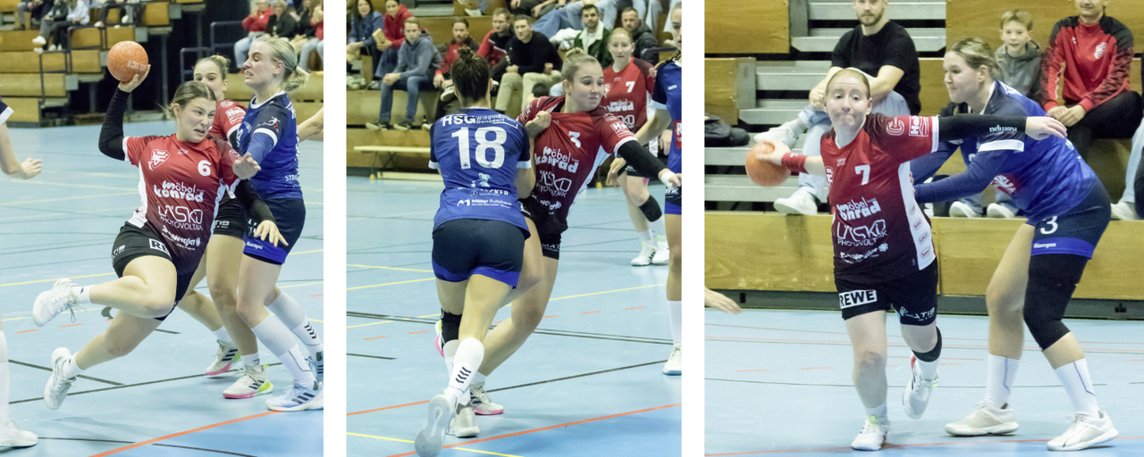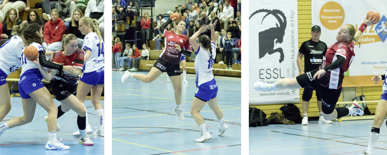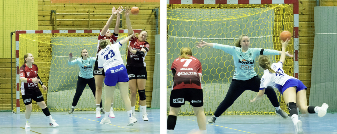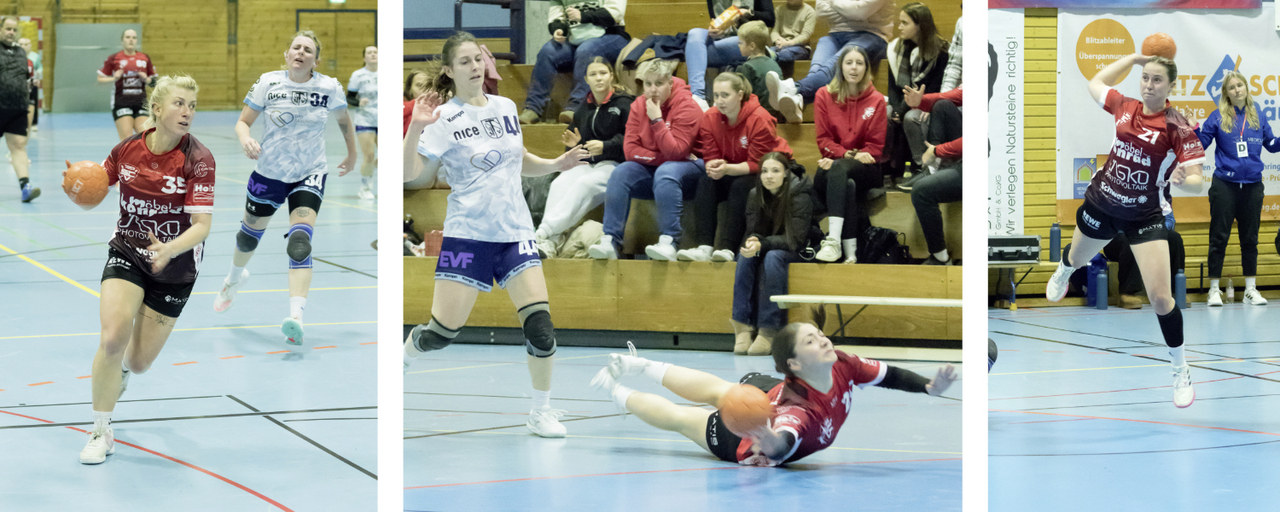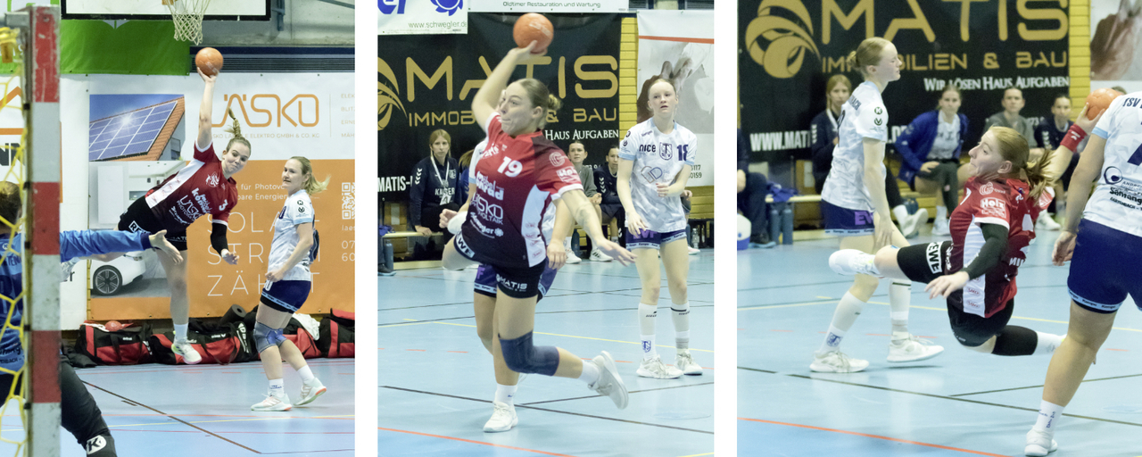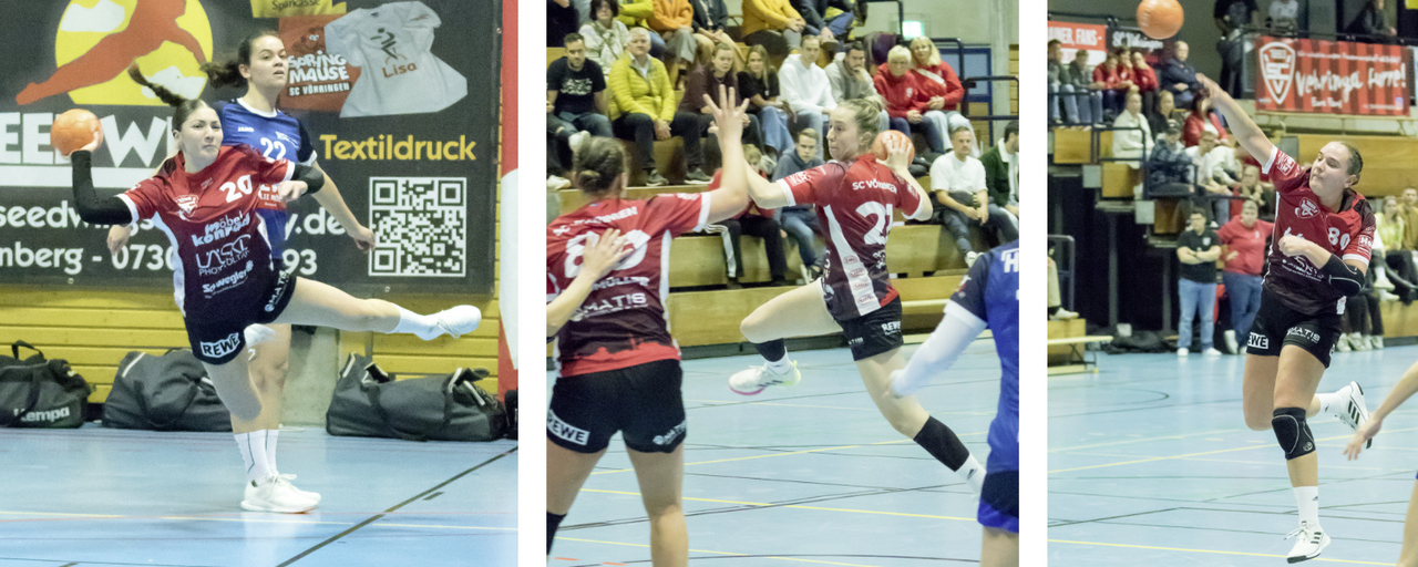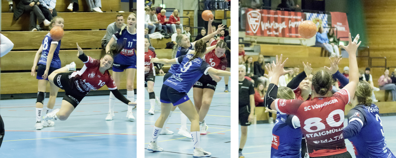 Mit hohem Tempo und guter Trefferquote starteten beide Teams in die Begegnung – bis zum 4:4 nach knapp sieben Spielminuten waren Begegnung und Spielverlauf auf Augenhöhe, für das Heimteam hatten Mara Hilsenbeck, Theresia Miller, Marina Gruber und Alicia Staigmüller getroffen. Danach ließ die Vöhringer Abwehr einige Zeit insbesondere durch die Mitte gar nichts mehr zu; die Gäste suchten ihr Glück über die Außenpositionen und diese Versuche waren häufig eine Beute von Torfrau Nadja Max. Annika Hamm und Alicia Staigmüller legten zum 6:4 vor; die folgende Zeitstrafe gegen den SCV überstand das Team nicht nur unbeschadet sondern erkämpfte sich einen Siebenmeter den Alicia zum 7:4 verwandelte. Die Abwehr stand weiter sicher und so konnten Maren Richter und Theresia Miller per Tempogegenstoß auf 10:6 vorlegen. In den letzten zehn Minuten vor dem Halbzeitpfiff war dann viel Platz auf dem Feld: insgesamt sieben Zeitstrafen setzte es in dieser Phase gegen beide Teams. Doch daraus konnten die Vöhringer Frauen mehr Kapital schlagen als ihre Gegnerinnen, gerade in den letzten drei Minuten vor dem Seitenwechsel baute eine wiederum toll aufspielende Theresia Miller die Führung auf 15:10 aus.