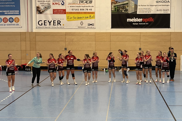Nach dem Seitenwechsel startete Vöhringen in Überzahl, aber statt den Vorsprung zu vergrößern, vergab man diese Gelegenheit leichtsinnig und handelte sich noch zwei Gegentore zum 15:12 ein. Doch dann schüttelten sich die Mädels wieder und Theresia Miller und Alicia Staigmüller hatten drei Zeigerumdrehungen später wieder auf 17:12 vorgelegt. Die Gäste wehrten sich tapfer und verkürzten nochmals auf 18:15; da Vöhringen dann einen Siebenmeter an den Pfosten setzte hatte die FSG Altenstadt/Geislingen sogar die Möglichkeit auf zwei Tore zu verkürzen. Doch mit vereinten Kräften wurde dies verhindert und dann nutzten die Vöhringer Goalgetterinnen Alicia Staigmüller und Theresia Miller ihre Chancen wieder, sie ließen beim 20:15 einen beruhigenden Vorsprung an der Anzeigetafel aufleuchten. Da die Abwehr weiterhin sicher stand, geriet der Vöhringer Sieg ab diesem Zeitpunkt nicht mehr in Gefahr; im Gegenteil – unsere Rückraumspielerinnen Carla Pfetsch und Lina Schiller bauten mit jeweils zwei Toren die Führung auf 25:18 etwa zehn Minuten vor Spielende aus. Mit diesem Vorsprung im Rücken wurde in der Offensive dann etwas der Fuß vom Gaspedal genommen. Die beiden letzten Vöhringer Tore gingen auf das Konto von Lina Schiller und Alicia Staigmüller; den Gästen gelang noch eine moderate Ergebniskorrektur. Da spielte es auch keine Rolle mehr, dass Loretta Hesse nach einem unglücklichen Zusammenprall 15 Sekunden vor Schluss disqualifiziert wurde; den fälligen Strafwurf verwandelte der Gegner zum 27:22 Endstand.