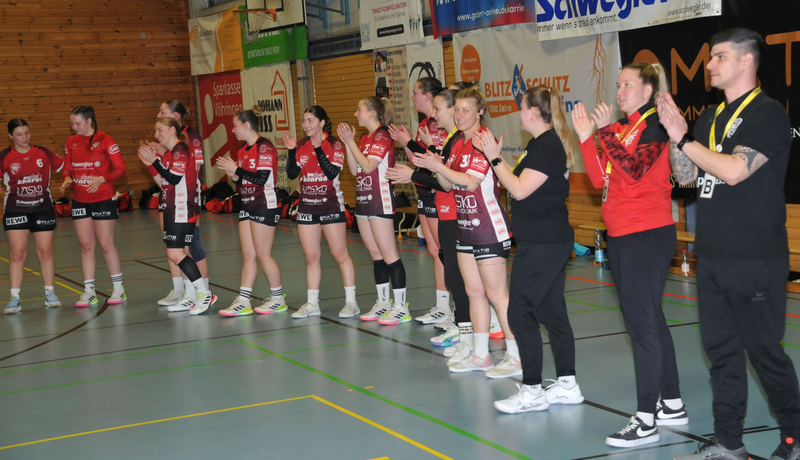 Nach dem Seitenwechsel leisteten die Gäste wieder erheblich mehr Gegenwehr. Carla Pfetsch traf erneut aus dem Rückraum und Mara Hilsenbeck legte zum 18:13 nach. Dann hatten die Vöhringer Spielerinnen aber einige Zeit mit mehreren Problemen zu kämpfen. Zeitstrafen, Pfosten- sowie Lattentreffer (einmal blieb der Ball beim Torwurf an der Innenseite des Pfostens auf der Linie kleben) und weitere vergebene Chancen sorgten dafür, dass der Vorsprung beim 18:16 Mitte der zweiten Halbzeit deutlich geschrumpft war. Theresia Miller erzielte das 19:16, aber zwei weitere Gegentore brachten die SG Brenztal auf Schlagdistanz zum 19:18. Dann wurde eine Überzahlsituation durch Lilli Hieber von Linksaußen und Alicia Staigmüller aus dem Rückraum zum 21:18 genutzt. Doch fünf weitere torlose Minuten sorgten wieder für Sorgenfalten bei den Vöhringer Fans – die SG Brenztal stellte fünf Minuten vor Spielende wieder auf 21:20. Aber die Vöhringer Abwehr und Torhüterin Katharina Hinterkircher leistete nun wieder ganze Arbeit und in der Offensive war es mal wieder Alicia Staigmüller, die sich trotz Behinderung durch Gegenspielerinnen zweimal durchsetzte und mit dem 23:20 für die Entscheidung sorgte. Den Gästen gelang zwar noch das 23:21, aber die Vöhringer Fans zollten ihren Spielerinnen bereits mit stehendem Applaus Respekt für die Energieleistung an diesem Tag.