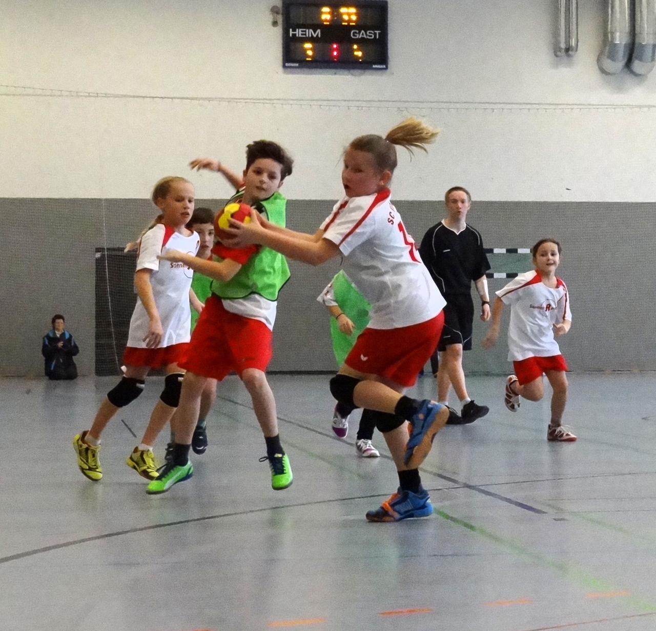 "Wir hatten zu viel Respekt",stellte Trainerin Katharina Vogel nach dem ersten Spieltag in der Bezirksliga fest. Als aboluter Außenseiter waren die Vöhringer Mädchen in die Partie gegen den ausschließlich mit Jungs angetretenen TSV Niederraunau gegangen. In der Vorrunde hatte Niederraunau die Konkurrenz reihenweise mit 15 bis 20 Toren Differenz geschlagen. Entsprechend selbstbewusst ging der TSV die Sache an, während unsere Mädchen etwas brauchten, um sich auf ihre Stärken zu besinnen. Schnell lagen sie 0:6 zurück, ehe sie besser zu ihrem Spiel fanden. 1:7 stand es zur Pause, wobei den Vöhringern vor allem die Tatsache zu schaffen machte, dass der Gegner mit einer 6:0-Deckung agierte, was in dieser Altersklasse eigentlich nicht erlaubt ist. In der zweiten Halbzeit ging der SCV deutlich aggressiver zur Sache, bis zum 3:13 sah es so aus, als sollte ein achtbares Ergebnis herausspringen. Doch in den letzten Minuten schwanden zunehmend die Kräfte, da das Team wieder ohne Auswechselspielerin auskommen musste: Lea Remlinger hatte sich zu Wochenbeginn verletzt. Am Ende verlor der SCV mit 3:19.