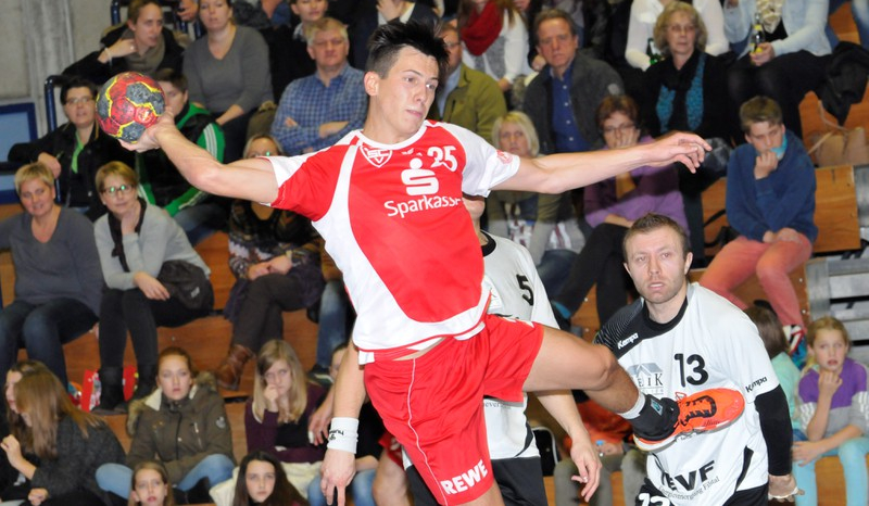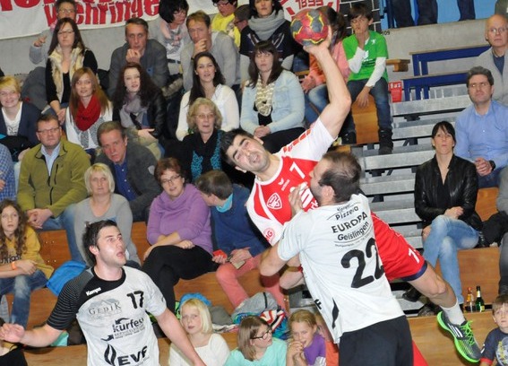 Von Beginn an entwickelte sich ein Spiel zweier guter Teams – beide mit laustarkem Anhang im Rücken. Die Gastgeber legten durch den neunfachen Torschützen Tobias Klenner zweimal vor, George Stanciu und André Bluhm egalisierten. Erneut Bluhm besorgte die erste Vöhringer Führung, dann reagierte David Schuler nach einem Abpraller gut und der erneut sehr treffsichere Valentin Istoc stellte auf 5:4 für den SCV (11. Minute). Bis zum 7:6 lagen die Rot-Weißen knapp in Front, dann gelangen dem SKV durch seine starke Flügelzange Hablizel/Klenner drei Tore in Serie zum 9:7 (17. Minute). Dem wollte „Vali“ Istoc nicht nachstehen und setzte seinerseits einen „Dreierpack“, 10:10 (21. Minute). Die Vöhringer Keeper Fabian Seiler und Andrei Mitrofan hielten gut – beide wechselten sich in bewährter Weise bereits im ersten Durchgang ab, dennoch konnte man kein weiteres Kapital daraus schlagen, weil auch der junge Marc Vogel im SKV-Gehäuse einige Bälle entschärfte. So legte Unterensingen wieder zum 12:10 vor, nach André Bluhms Treffer betrug der Rückstand beim 11:14 erstmalig sogar drei Tore (25. Minute). Dann trafen die beiden Linkshänder Christian Bucher und Matthias Briem zum 15:13 und 16:13, doch in der letzten Minute vor der Halbzeit konnte Vöhringen zwei Ballgewinne nutzen, Valentin Istoc und Tobias Hermann waren zum 16:15 erfolgreich.