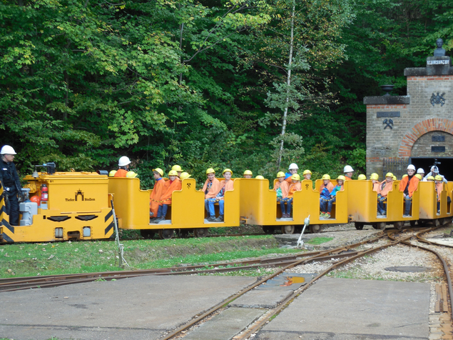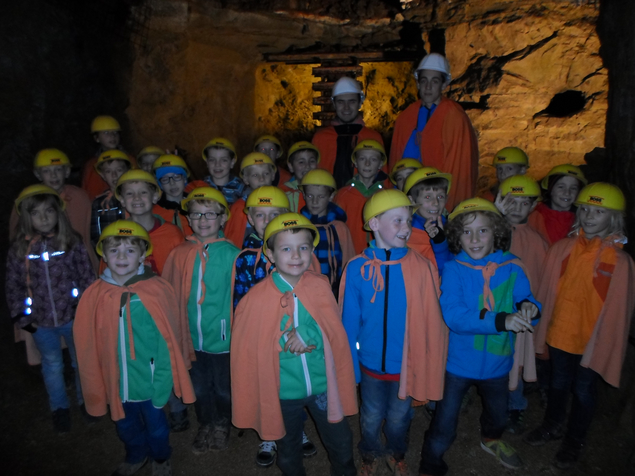 Bei bester Laune und Wetter trafen sich die Minis am 27.9.14 am Bahnhof, um mit Bahn und Bus nach Aalen zum Tiefen Stollen, einer Erzgrube, zu fahren. Mit Helm und Umhang ausgestattet ging es mit dem "Grubenbähnle" rund 400m tief in den Berg hinein, wo wir während eines 800m langen Rundweges bei einer Führung interessante Einblicke in die harte Arbeit der Kumpel erhielten.