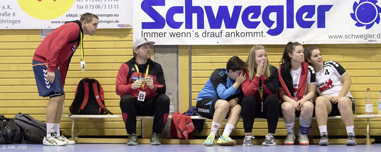 Zunächst ging Wiblingen in Führung, doch die Außenspielerinnen Annabel Allmendinger und Theresia Miller wurden prima freigespielt und konnten Vöhringen im Spiel halten. Allerdings waren bereits in den ersten fünf Minuten mehrere Schritt- oder Dribbelfehler dafür verantwortlich, dass der Ballbesitz viel zu schnell wieder beim Gegner landete. Katrin Hafenrichter konnte letztmals den Anschluss zum 5:6 herstellen, aber dann handelte sich das Vöhringer Team schnell den obligatorischen drei-Tore-Rückstand beim 5:8 ein. In dieser Phase der Partie spielte Wiblingen fünfmal fast direkt hintereinander den gleichen Spielzug mit einem Einlauf ihres Rechtsaußen über den Rückraum zur Mitte und viermal wurde die Vöhringer Abwehr damit erfolgreich düpiert. Im Angriff gab es zwar durchaus vielversprechende Chancen, aber die Trefferquote aus Vöhringer Sicht wurde zunehmend schlechter. Da die eigene Abwehr weiterhin bereitwillig zuschaute, wie die Gegnerinnen teilweise aus dem Stand in die Lücken der Deckung starteten, ließ ein Rückstand von 7:13 nach knapp 18 Minuten nicht lange auf sich warten. Bernhard Kast nahm bereits die zweite Auszeit, aber am grundsätzlichen Spielverlauf änderte sich bis zur Pause nichts. Einzig Annabel Allmendinger mit vier weiteren Treffern vor dem Pausenpfiff war es zu verdanken, dass man bis dahin mit 13:17 „nur“ vier Tore hinten lag.