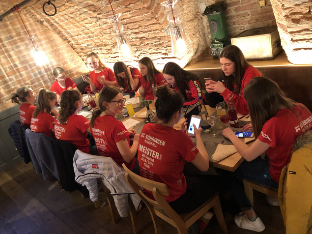 Nach einer längeren Duscheinheit – konnten sie sich aber trotzdem über die gelungene Saison und die Meistershirts freuen! Beim anschließenden Abschlussessen wurde bereits wieder gelacht!