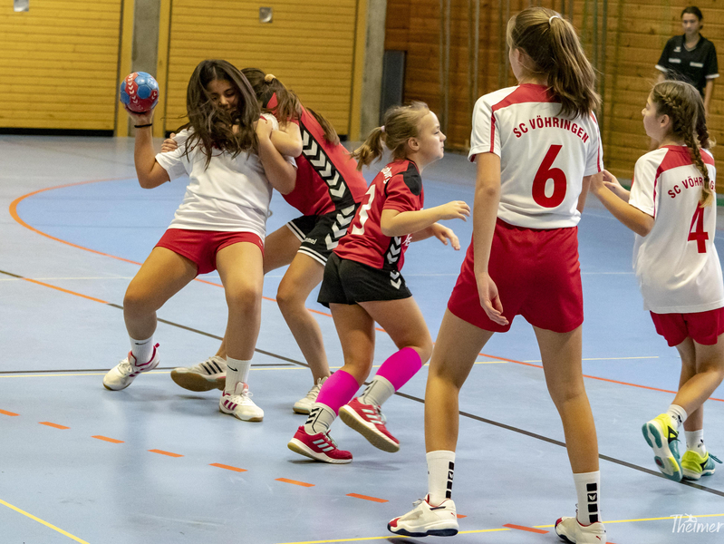 Der erste Gegner war am Sonntagmorgen um zehn Uhr Günzburg. Die Mädels kamen nur schleppend in die Partie. Die Abwehr hatte zu Beginn Schwierigkeiten die gegnerischen Spielerinnen vom Tor fern zu halten. Doch schon von Beginn an zeigte Lara Rettermeier im Tor eine gute Leistung und konnte einige gegnerische Bälle parieren. Im Angriff spielte man sich Chancen heraus, scheiterte aber zu oft an der generischen Torhüterin. So ging es nur mit einem minimalen Vorsprung von 6:5 in die Halbzeitpause. Für die zweite Halbzeit hatte man sich vorgenommen in der Abwehr sicherer zu stehen und vorne die sich ergebenden Chancen besser zu nutzen. Dies klappte auch zu Beginn des zweiten Abschnittes und man konnte auf 9:6 davonziehen. Doch leider schlichen sich dann Fehler in das Spiel der Mädels ein und Günzburg konnte auf 9:8 herankommen. Die letzten fünf Minuten waren dann aber in Vöhringer Hand und so konnte man das Spiel auch dank einiger Kontertore mit 12:8 gewinnen.