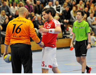 Dennoch, die ersten zwanzig Minuten gestalteten sich zäh. Thilo Brugger erzielte die beiden ersten SCV-Tore, aber Feldkirch, das im quirligen Spielmacher Kassian Matt, im wuchtigen Rückraumakteur Simon Dolovic und im cleveren Routinier Petar Roganovic seine Aktivposten hatte, blieb auf Augenhöhe. Auch nach dem 4:2 vom umtriebigen Lukas Koßbiehl (7. Minute), Michael Deutschmann egalisierte von Rechtsaußen, und nach seinem verworfenen Siebenmeter brachte Dolovic die Gäste beim 5:6 erstmalig in Führung (15. Minute). Koßbiehl, der sich schlau in den Rücken der Abwehr gestohlen hatte, glich aus und brachte seine Farben im Verbund mit Brugger und Valentin Istoc zum ersten Mal mit zwei Toren in Front - 9:7, 21. Minute. Es blieb eng, Thomas Erlacher und Dolovic trafen zum 10:9. Torgarant Istoc warf zum 11:9 ein, und Felix Eilts entschied bereits das zweite Strafwurfduell für sich. Igor Mihali, toll bedient von Stefan Beljic netzte vom Kreis ein, und Koßbiehl fing einen Querpass heraus und brachte seinen Konterlauf unter - 13:9 (25. Minute). Beljic und Koßbiehl hielten den Abstand konstant, bei Gegentreffern von Roganovic und Daniel Versluis. Kurz vor der Pause sah Stefan Beljic dann die rote Karte - sein Siebenmeter-"Leger" hatte HC-Hüter Istvan Kallai unabsichtlich am Kopf erwischt. Roganovic war es schließlich, der mit einem trockenen Wurf den Halbzeitstand von 15:12 herstellte.