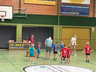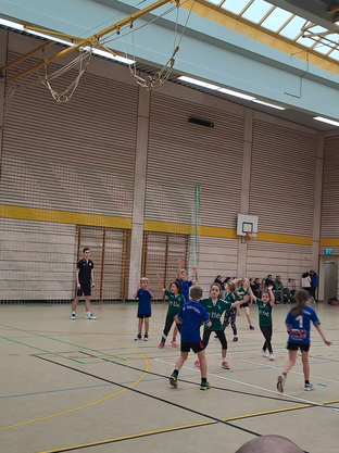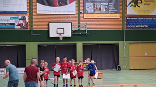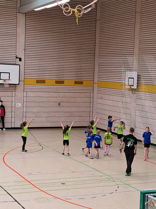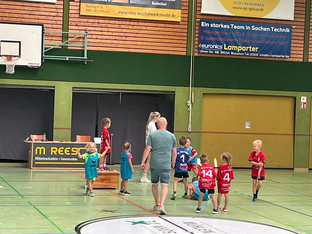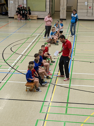 Nach dem gemeinsamen Aufwärmen ging es dann auch schon mit den ersten Spielen los. 18 Spiele, verteilt auf zwei Felder, waren zu absolvieren. Hier gilt es allen teilnehmenden Mannschaften ein großes Kompliment auszusprechen, denn der eng getaktete Spielplan wurde erfolgreich eingehalten. Daran hatte auch das Kampfgericht Milan und David aus der mD/gE einen großen Anteil, die gekonnt durch die Reihenfolge der Spiele führten und stets alles im Blick hatten.