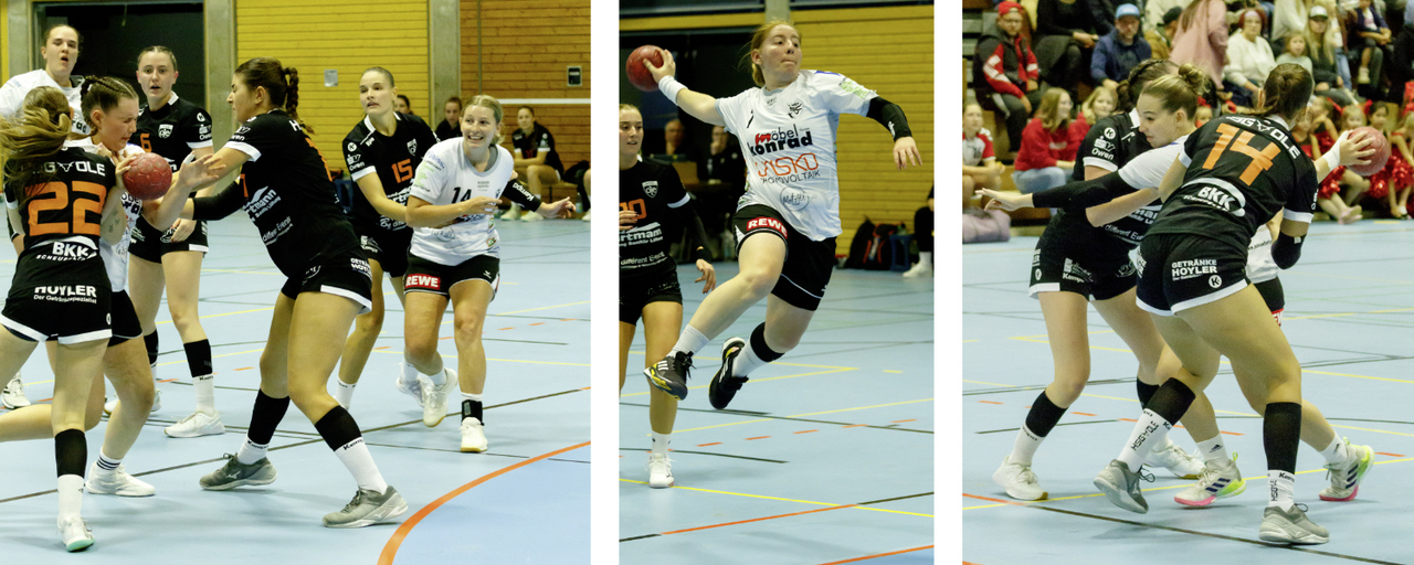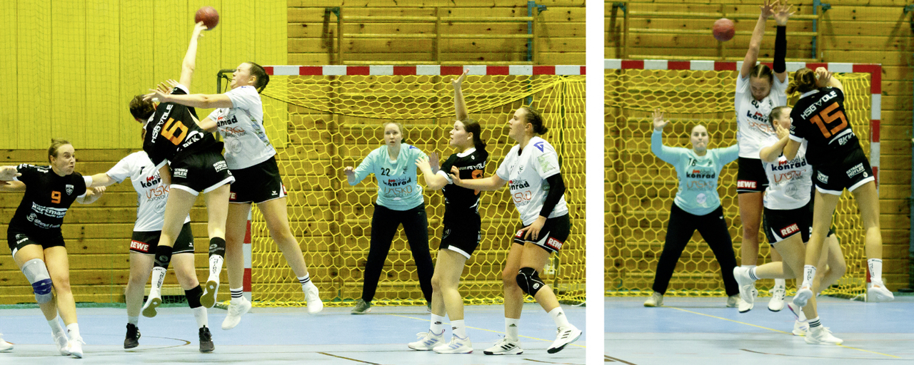 Im Gegensatz zu den letzten Punktspielen ging der Start in die Partie nicht schief; von Anfang an war man mit dem Gastgeber auf Augenhöhe. Bis zum 3:3 nach fünf Spielminuten gelangen den Vöhringer Frauen schöne Spielzüge und erfolgreiche Torabschlüsse durch Lilli Hieber und Victoria Giehle. Danach wurden die Abwehrreihen incl. der Torhüterinnen auf beiden Seiten allmählich dominanter und machten der gegnerischen Offensive jeweils das Leben schwer. Für Vöhringen war in den nächsten zehn Minuten dreimal Alicia Staigmüller bis zum 6:6 erfolgreich. Nicole Fuchs verwandelte vom Kreis und nachdem Victoria Giehle zweimal die Lücke in der gegnerischen Abwehr gefunden hatte, lag das Vöhringer Frauenteam mit 8:9 in Front. Alicia Staigmüller und Leonie Schiller sorgten für die knappe 10:11 Pausenführung.