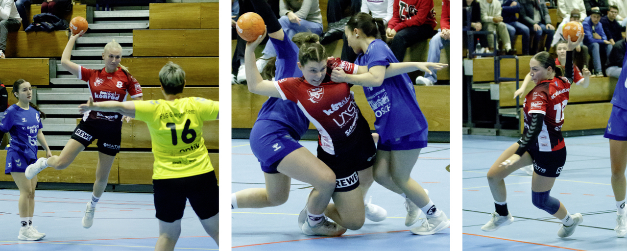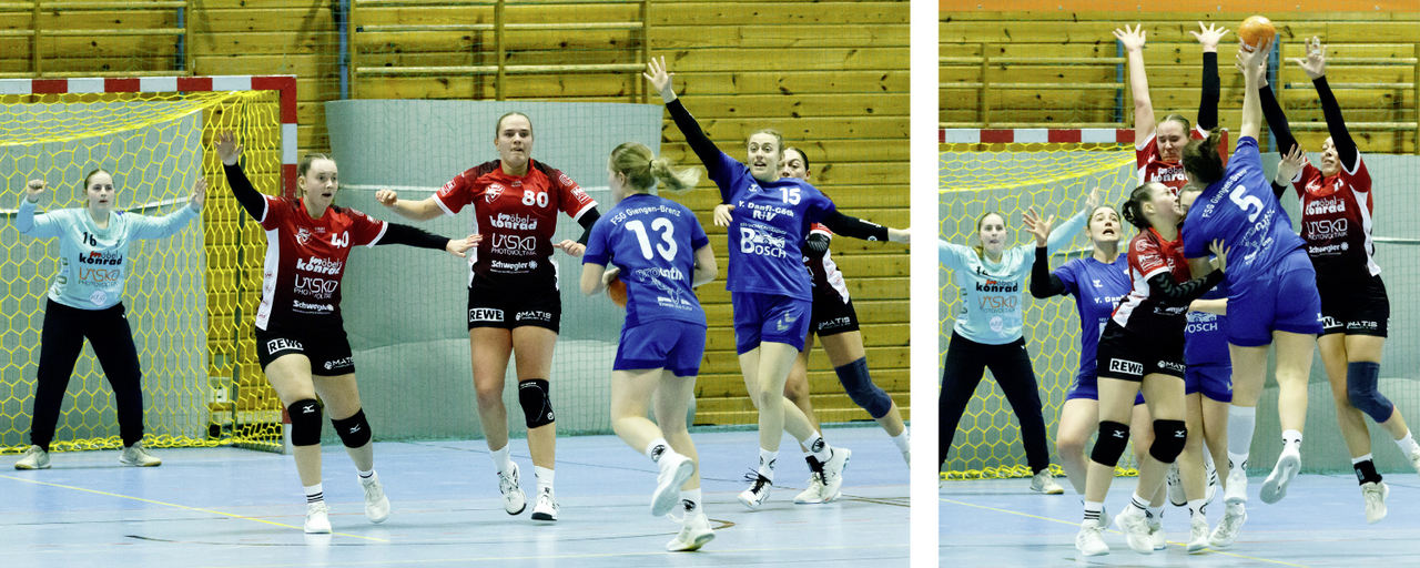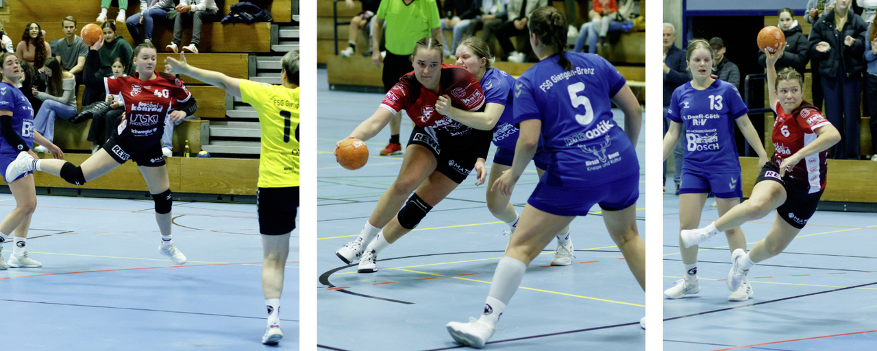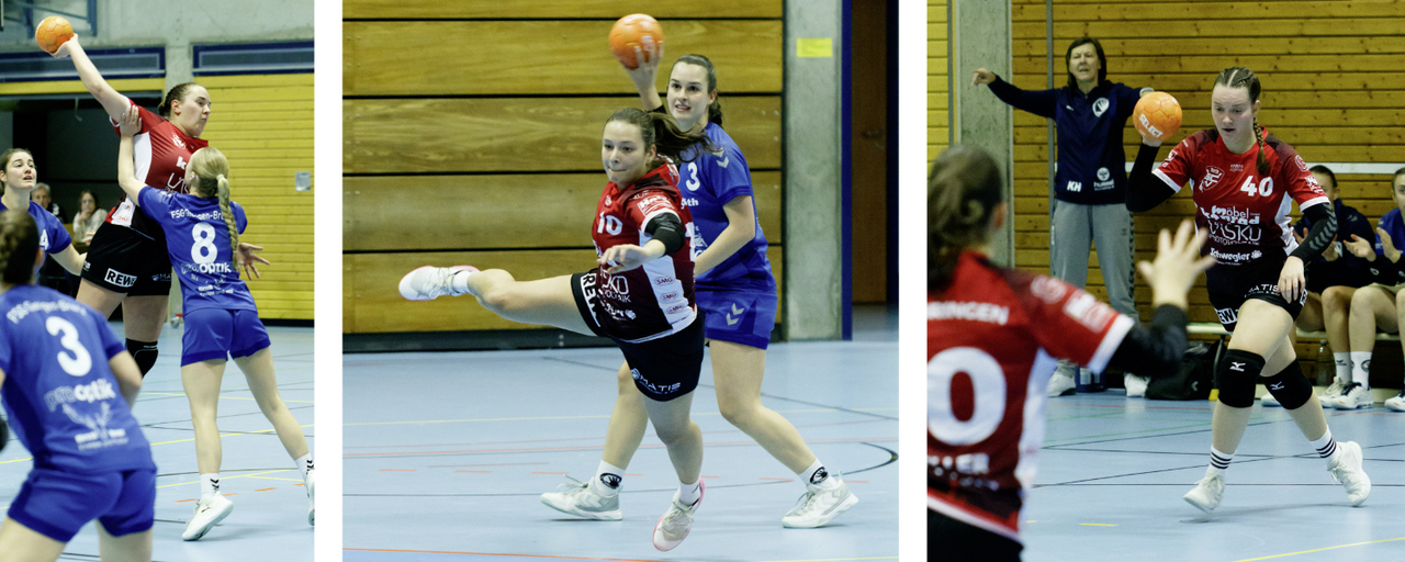 Leider starteten die Vöhringerinnen ähnlich wie letzte Woche unkonzentriert in die Partie und waren nach knapp sieben Minuten bereits mit 1:5 im Hintertreffen, lediglich Alicia Staigmüller konnte einen Treffer für sich verbuchen. Postwendend griff Coach Andras Csuka zur Timeout-Karte und holte seine Spielerinnen zusammen. Doch auch diese Auszeit brachte das Team des SC Vöhringen nicht zurück in die Spur, zwar konnte man den Rückstand ab diesem Zeitpunkt bei zwei beziehungsweise drei Toren halten, mehr war aber nicht drin. Bis zum 5:7 in der 12. Minute konnten sich Alicia Staigmüller, per 7-Meter und Tempogegenstoß, Nicole Fuchs und Theresia Miller in die Torschützenliste eintragen. In den nächsten 15 Minuten passierte nicht viel, da die FSG weiterhin einfache Tore erzielen konnte, schrumpfte der Rückstand aus Sicht der Vöhringer nicht, blieb allerdings immer bei den zwei bis drei Toren. Das 9:11 erzielte Leonie Schiller in der 21. Minute und konnte somit einen Treffer auf ihrem Torekonto verbuchen. Kurz vor dem Halbzeitpfiff stellten die Vöhringerinnen durch Tore von Lina Schiller und Nicole Fuchs erstmals den Anschluss her, leider ließ man die Gegnerinnen erneut punkten und so ging es mit 13:15 in die Halbzeitpause.