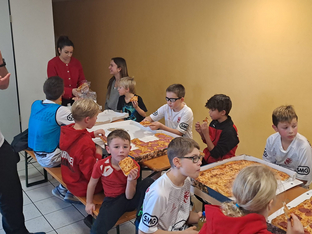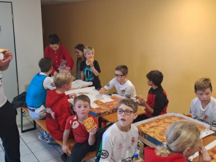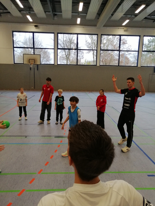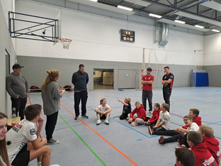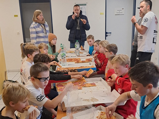 Nach dem Spieltag fuhr man gemeinsam in den Sportpark, um eine kleine Weihnachtsfeier abzuhalten. Mit gesponsorter Pizza konnte sich die Mannschaft stärken, ehe es in der Halle wieder nur um den Ball ging. Große Freude bereitete den Kindern die Anwesenheit von Felix und Laurens aus der männlichen A-Jugend, die zusammen mit den Kindern Handball spielten. Dabei war manche merkwürdige Regelauslegung zu beobachten und der ein oder andere Trickwurf wurde ausgepackt.