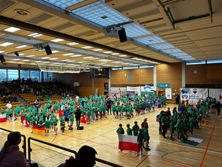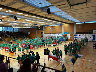 Los ging es dann am Samstag mit der feierlichen Eröffnungsfeier, bei der alle Teams mit den Länderflaggen in die Kuhberghalle einzogen. Begleitet von den jeweiligen Nationalhymnen und unter dem Applaus der Eltern hatte der Einzug einen feierlichen Charakter.