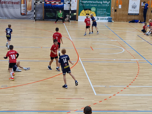 Dann ging es mit den Gruppenspielen los und für den Vöhringer Nachwuchs hieß es erstmal, sich an die Gegebenheiten anzupassen: Es wurde auf das Querfeld mit nur 4 Feldspielern gespielt und die Anzahl der erzielten Tore mit der Zahl der Torschützen multipliziert. Bei 10 Minuten Spielzeit blieb also nicht viel Zeit für Fehler und es galt, von Anfang an da zu sein.
