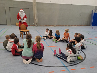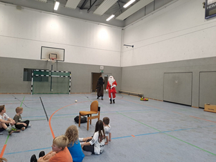 Da öffnete sich die Tür, und herein kamen – der Nikolaus und Knecht Ruprecht! Beide hatten einen großen Sack dabei und ein freundliches Lächeln im Gesicht. Die Kinder waren begeistert! Sie stellten sich in einer Reihe auf, und Nikolaus erzählte, dass er schon viel Gutes über die fleißige F-Jugend des SC Vöhringen gehört habe. „Ihr trainiert so toll und seid immer mit Freude dabei“, sagte er.