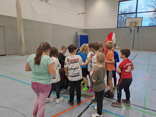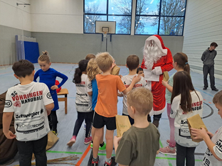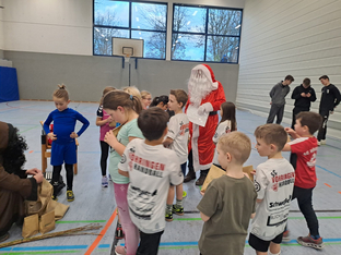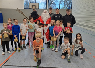Nikolaus und Knecht Ruprecht überraschen die gemischte F-Jugend des SC Vöhringen