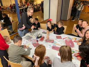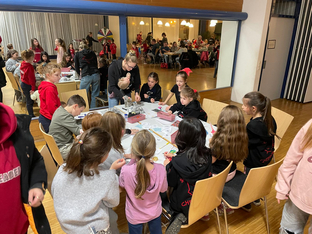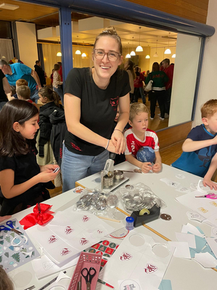 Das Glücksrad mit süßen Gewinnen zog die Kinder magisch an, beim Zuckerstangen-Geschicklichkeitsspiel war Geschick und Konzentration gefragt und der Eierlauf mit Christbaumkugeln sorgte für viele lachende Gesichter. Das absolute Highlight war jedoch das Button-Basteln: Über 100 Buttons wurden in nur 40 Minuten gepresst. Mit viel Kreativität entstanden Motive mit Handballern, Cheerleadern, SCV-Logos und weihnachtlichen Designs – jedes Stück ein echtes Unikat.