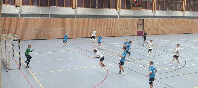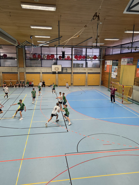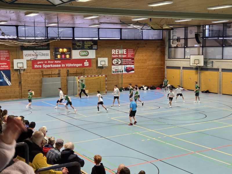 Zu Spielbeginn fehlte die geistige Frische und so war man in der Abwehr oft einen Schritt zu spät und im Angriff leistete man sich einige leichte Ballverluste gegen eine sehr früh angreifende Waltenhofener Mannschaft. So stand es nach 10 Minuten 5 : 5 Unentschieden, was aus SCV-Sicht vor allem unserem Torwart Lenny zu verdanken war. Jedem Vöhringer war bewusst, dass eine Steigerung nötig ist, um dieses Spiel zu gewinnen. Und die jungen SCV-ler zeigten nun welches Talent in ihnen steckt, bissig in der Abwehr und mit dem schon gewohnten Tempohandball erspielte man sich bis 30 Sekunden vor dem Halbzeitpfiff eine 23 : 12 Führung. Durch 2 leichtsinnige Fehler konnte der TV Waltenhofen noch auf 23 : 14 zur Halbzeit verkürzen. Zu diesem Zeitpunkt war das Spiel äußerst fair, je eine Zeitstrafe pro Mannschaft und auch keinerlei Unterbrechungen wegen Verletzungen.