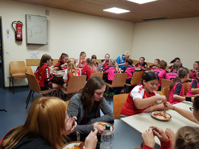 Nach dieser anstrengenden Trainingseinheit gab es wohlverdiente Spaghetti mit Tomatensoße sowie leckere Snacks wie Muffins, Müsliriegel, Obst und Trauben-Käse-Spieße. Zubereitet wurden all diese leckeren Sachen von den Eltern der SCV-Mädels.